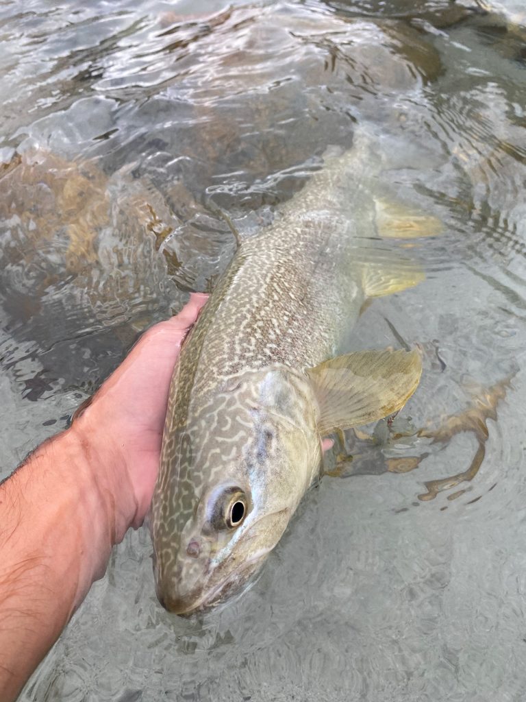 …I persistently fished the pool, caught a few smaller fish, and was almost ready to move on when, after a delayed strike, I was surprised by an unusual response. The hooked mass moved slightly but without jerking, so I increased the tension. The fish woke up and pulled strongly deeper. Flooded with adrenaline, my glucose levels immediately rose, and with a rapid heartbeat I quickly removed excess line, followed the fish, and reacted calmly. What on earth is this? I wondered about a possible accidentally hooked huchen, and then for the first time saw a shade of yellow. At first, I could not believe my eyes. The fish soon showed itself again and removed all doubt. Shortly after, a remarkably large brown trout found itself in my net, and my heart skipped a beat…